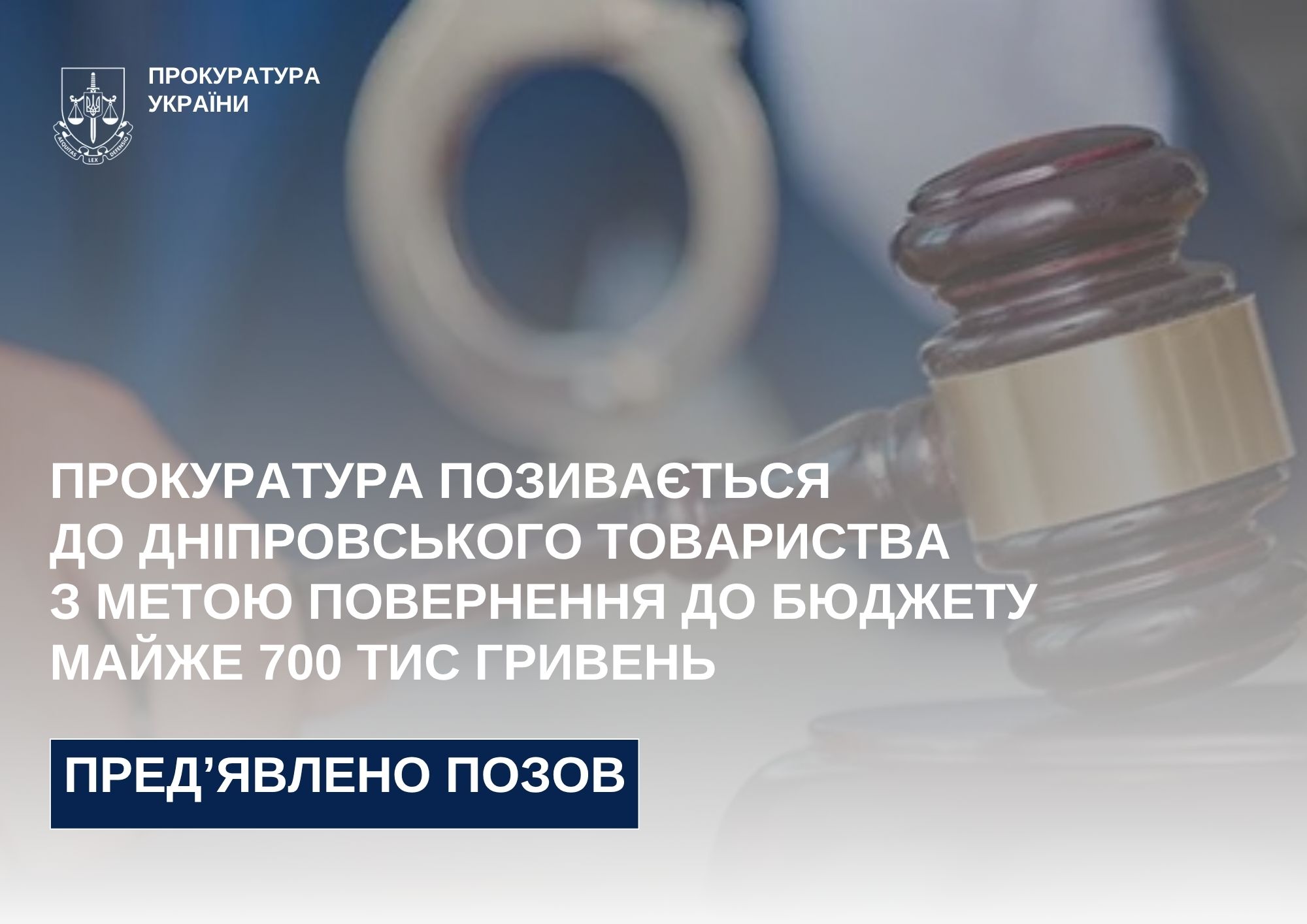 Прокуратура позивається до дніпровського товариства з метою повернення до бюджету майже 700 тис гривень